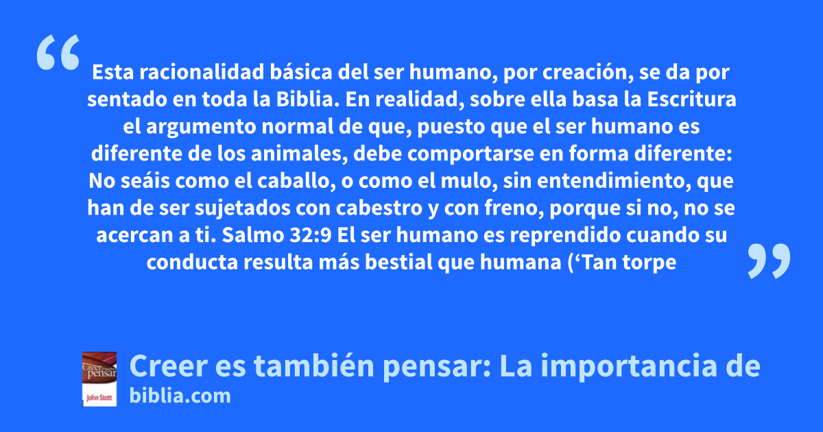 Esta racionalidad básica del ser humano, por creación, se da por sentado en toda la Biblia. En realidad, sobre ella basa la Escritura el argumento normal de que, puesto que el ser humano es diferente de los animales, debe comportarse en forma diferente: No seáis como el caballo, o como el mulo, sin entendimiento, que han de ser sujetados con cabestro y con freno, porque si no, no se acercan a ti. Salmo 32:9 El ser humano es reprendido cuando su conducta resulta más bestial que humana (‘Tan torpe