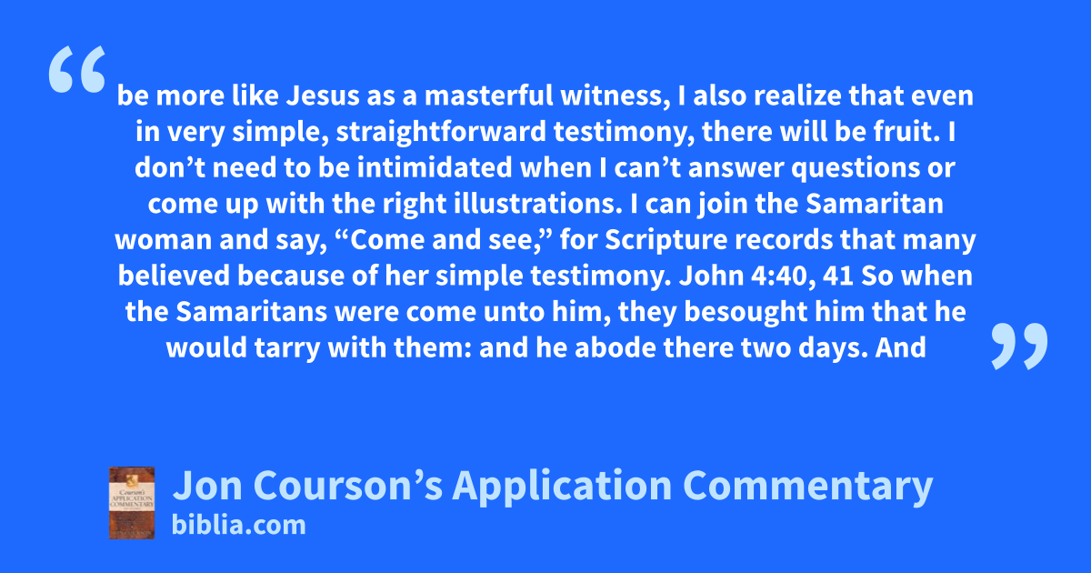 be more like Jesus as a masterful witness, I also realize that even in very simple, straightforward testimony, there will be fruit. I don’t need to be intimidated when I can’t answer questions or come up with the right illustrations. I can join the Samaritan woman and say, “Come and see,” for Scripture records that many believed because of her simple testimony. John 4:40, 41 So when the Samaritans were come unto him, they besought him that he would tarry with them: and he abode there two days. And