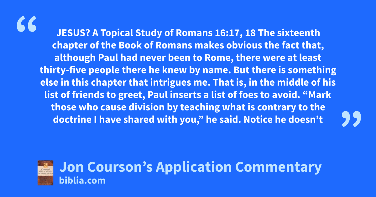 JESUS? A Topical Study of Romans 16:17, 18 The sixteenth chapter of the Book of Romans makes obvious the fact that, although Paul had never been to Rome, there were at least thirty-five people there he knew by name. But there is something else in this chapter that intrigues me. That is, in the middle of his list of friends to greet, Paul inserts a list of foes to avoid. “Mark those who cause division by teaching what is contrary to the doctrine I have shared with you,” he said. Notice he doesn’t