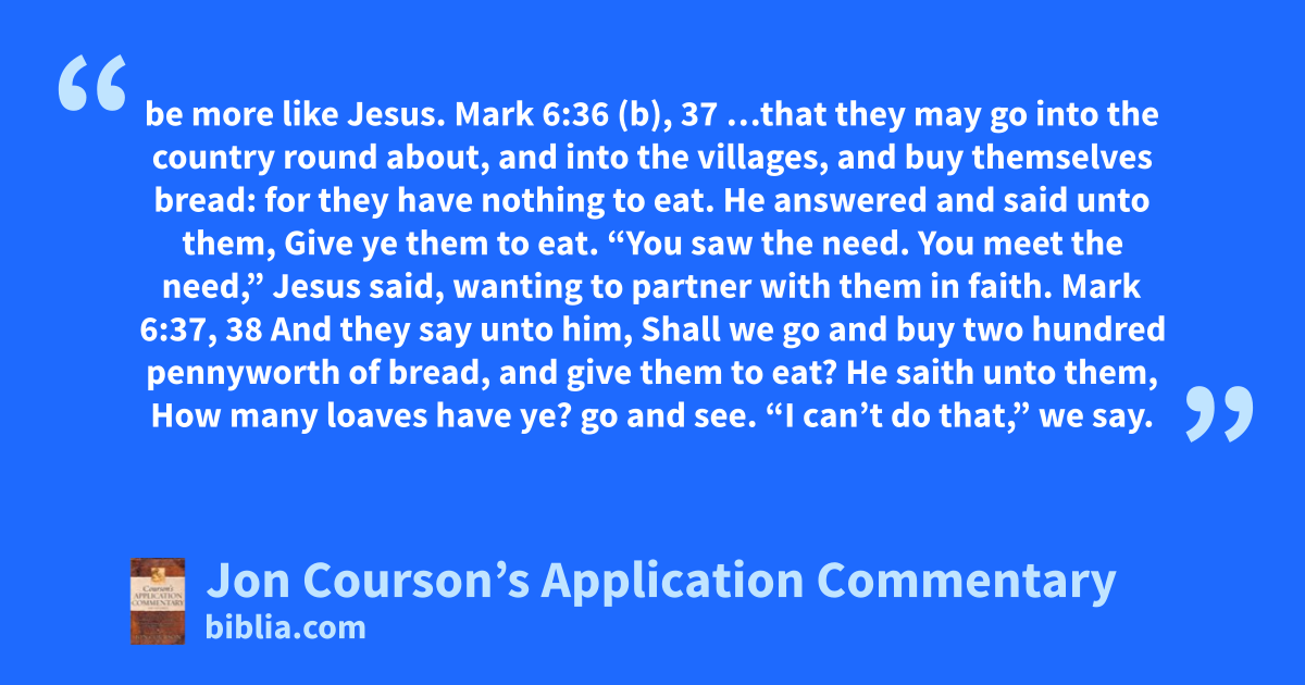 be more like Jesus. Mark 6:36 (b), 37 …that they may go into the country round about, and into the villages, and buy themselves bread: for they have nothing to eat. He answered and said unto them, Give ye them to eat. “You saw the need. You meet the need,” Jesus said, wanting to partner with them in faith. Mark 6:37, 38 And they say unto him, Shall we go and buy two hundred pennyworth of bread, and give them to eat? He saith unto them, How many loaves have ye? go and see. “I can’t do that,” we say.