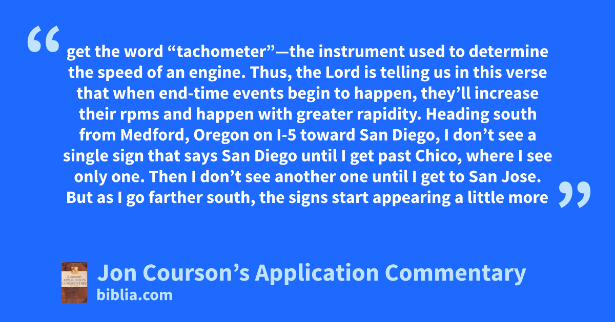 get the word “tachometer”—the instrument used to determine the speed of an engine. Thus, the Lord is telling us in this verse that when end-time events begin to happen, they’ll increase their rpms and happen with greater rapidity. Heading south from Medford, Oregon on I-5 toward San Diego, I don’t see a single sign that says San Diego until I get past Chico, where I see only one. Then I don’t see another one until I get to San Jose. But as I go farther south, the signs start appearing a little more
