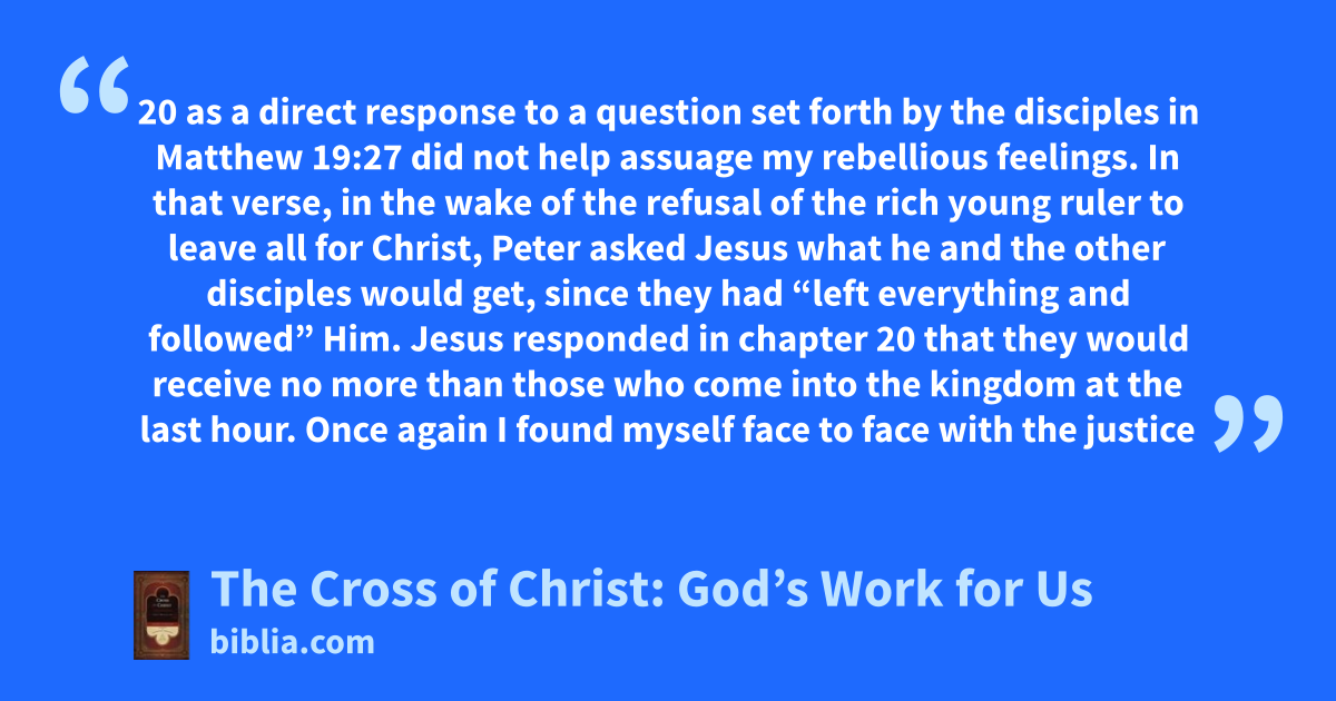 20 as a direct response to a question set forth by the disciples in Matthew 19:27 did not help assuage my rebellious feelings. In that verse, in the wake of the refusal of the rich young ruler to leave all for Christ, Peter asked Jesus what he and the other disciples would get, since they had “left everything and followed” Him. Jesus responded in chapter 20 that they would receive no more than those who come into the kingdom at the last hour. Once again I found myself face to face with the justice