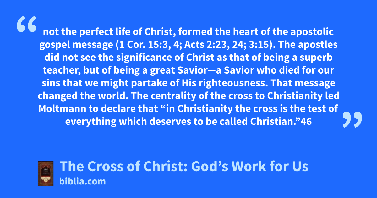 not the perfect life of Christ, formed the heart of the apostolic gospel message (1 Cor. 15:3, 4; Acts 2:23, 24; 3:15). The apostles did not see the significance of Christ as that of being a superb teacher, but of being a great Savior—a Savior who died for our sins that we might partake of His righteousness. That message changed the world. The centrality of the cross to Christianity led Moltmann to declare that “in Christianity the cross is the test of everything which deserves to be called Christian.”46