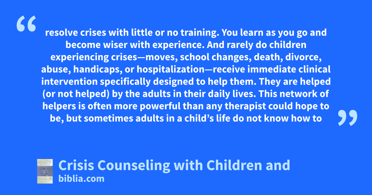 resolve crises with little or no training. You learn as you go and become wiser with experience. And rarely do children experiencing crises—moves, school changes, death, divorce, abuse, handicaps, or hospitalization—receive immediate clinical intervention specifically designed to help them. They are helped (or not helped) by the adults in their daily lives. This network of helpers is often more powerful than any therapist could hope to be, but sometimes adults in a child’s life do not know how to