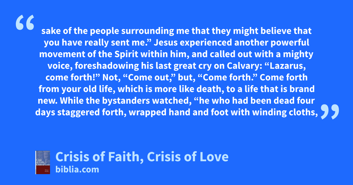 sake of the people surrounding me that they might believe that you have really sent me.” Jesus experienced another powerful movement of the Spirit within him, and called out with a mighty voice, foreshadowing his last great cry on Calvary: “Lazarus, come forth!” Not, “Come out,” but, “Come forth.” Come forth from your old life, which is more like death, to a life that is brand new. While the bystanders watched, “he who had been dead four days staggered forth, wrapped hand and foot with winding cloths,
