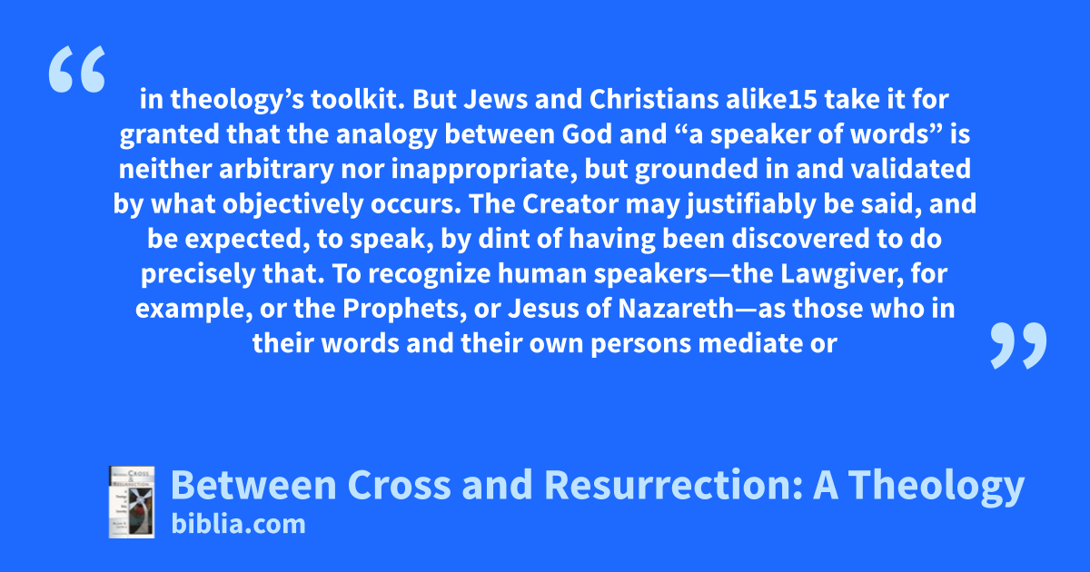 in theology’s toolkit. But Jews and Christians alike15 take it for granted that the analogy between God and “a speaker of words” is neither arbitrary nor inappropriate, but grounded in and validated by what objectively occurs. The Creator may justifiably be said, and be expected, to speak, by dint of having been discovered to do precisely that. To recognize human speakers—the Lawgiver, for example, or the Prophets, or Jesus of Nazareth—as those who in their words and their own persons mediate or