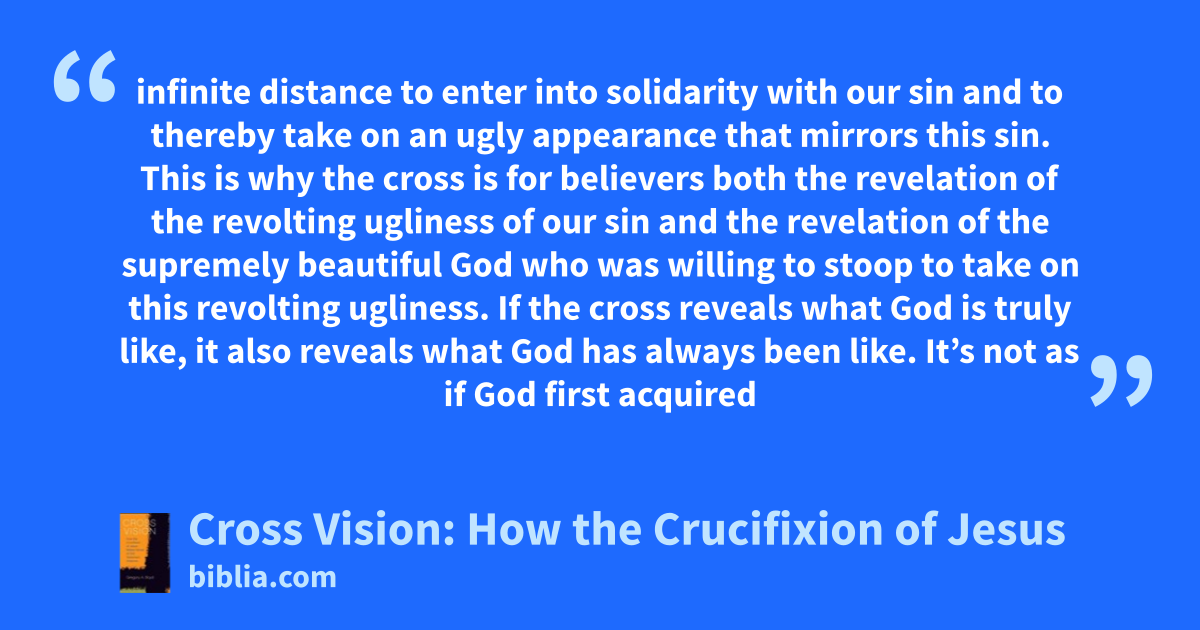 infinite distance to enter into solidarity with our sin and to thereby take on an ugly appearance that mirrors this sin. This is why the cross is for believers both the revelation of the revolting ugliness of our sin and the revelation of the supremely beautiful God who was willing to stoop to take on this revolting ugliness. If the cross reveals what God is truly like, it also reveals what God has always been like. It’s not as if God first acquired