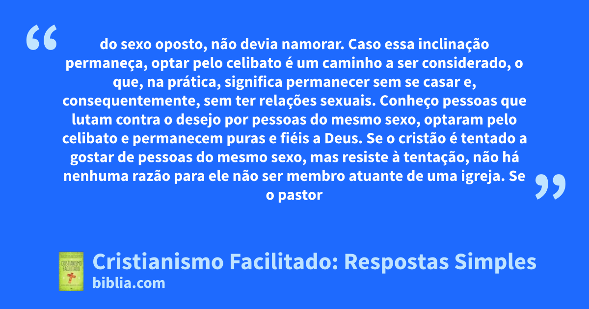 do sexo oposto, não devia namorar. Caso essa inclinação permaneça, optar pelo celibato é um caminho a ser considerado, o que, na prática, significa permanecer sem se casar e, consequentemente, sem ter relações sexuais. Conheço pessoas que lutam contra o desejo por pessoas do mesmo sexo, optaram pelo celibato e permanecem puras e fiéis a Deus. Se o cristão é tentado a gostar de pessoas do mesmo sexo, mas resiste à tentação, não há nenhuma razão para ele não ser membro atuante de uma igreja. Se o pastor