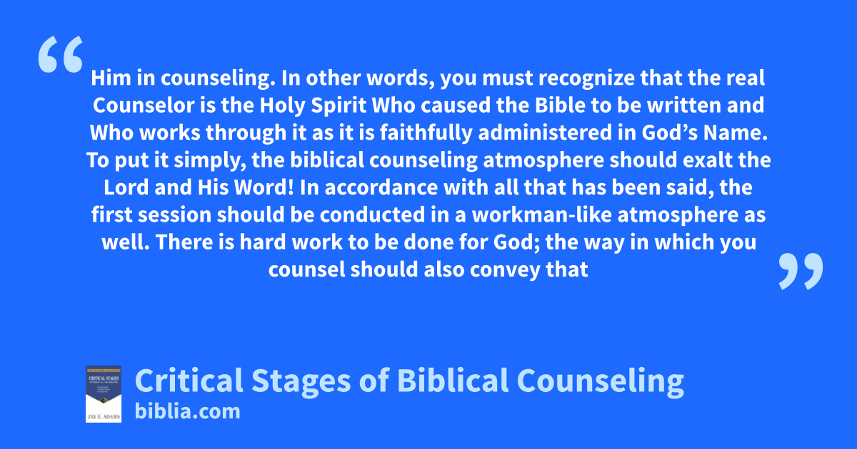 Him in counseling. In other words, you must recognize that the real Counselor is the Holy Spirit Who caused the Bible to be written and Who works through it as it is faithfully administered in God’s Name. To put it simply, the biblical counseling atmosphere should exalt the Lord and His Word! In accordance with all that has been said, the first session should be conducted in a workman-like atmosphere as well. There is hard work to be done for God; the way in which you counsel should also convey that