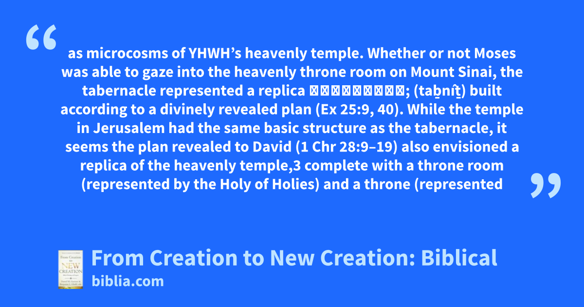 as microcosms of YHWH’s heavenly temple. Whether or not Moses was able to gaze into the heavenly throne room on Mount Sinai, the tabernacle represented a replica תַּבְנִית; (taḇnı̂ṯ) built according to a divinely revealed plan (Ex 25:9, 40). While the temple in Jerusalem had the same basic structure as the tabernacle, it seems the plan revealed to David (1 Chr 28:9–19) also envisioned a replica of the heavenly temple,3 complete with a throne room (represented by the Holy of Holies) and a throne (represented