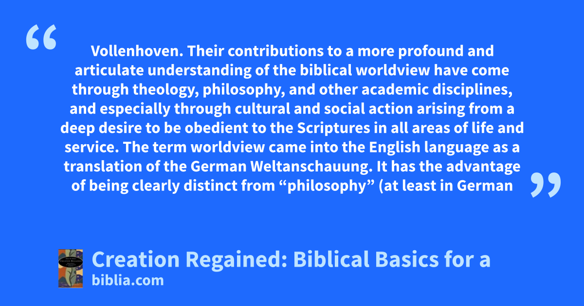 Vollenhoven. Their contributions to a more profound and articulate understanding of the biblical worldview have come through theology, philosophy, and other academic disciplines, and especially through cultural and social action arising from a deep desire to be obedient to the Scriptures in all areas of life and service. The term worldview came into the English language as a translation of the German Weltanschauung. It has the advantage of being clearly distinct from “philosophy” (at least in German