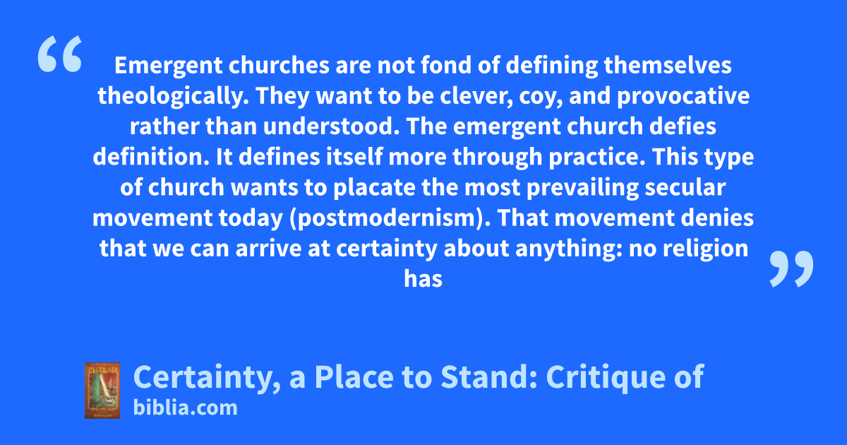 Certainty: A Place to Stand is a critique of the Emergent Church movement—a movement that began in the late twentieth century and has moved across the world in the past decade. The views of the Emergent Church are postmodern, stressing individualism, experience-based faith, and a lack of absolutes in matters of doctrine. While there are a number of praiseworthy effects that have arisen from this...