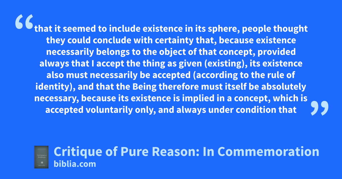 that it seemed to include existence in its sphere, people thought they could conclude with certainty that, because existence necessarily belongs to the object of that concept, provided always that I accept the thing as given (existing), its existence also must necessarily be accepted (according to the rule of identity), and that the Being therefore must itself be absolutely necessary, because its existence is implied in a concept, which is accepted voluntarily only, and always under condition that