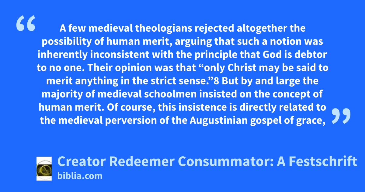 A few medieval theologians rejected altogether the possibility of human merit, arguing that such a notion was inherently inconsistent with the principle that God is debtor to no one. Their opinion was that “only Christ may be said to merit anything in the strict sense.”8 But by and large the majority of medieval schoolmen insisted on the concept of human merit. Of course, this insistence is directly related to the medieval perversion of the Augustinian gospel of grace,