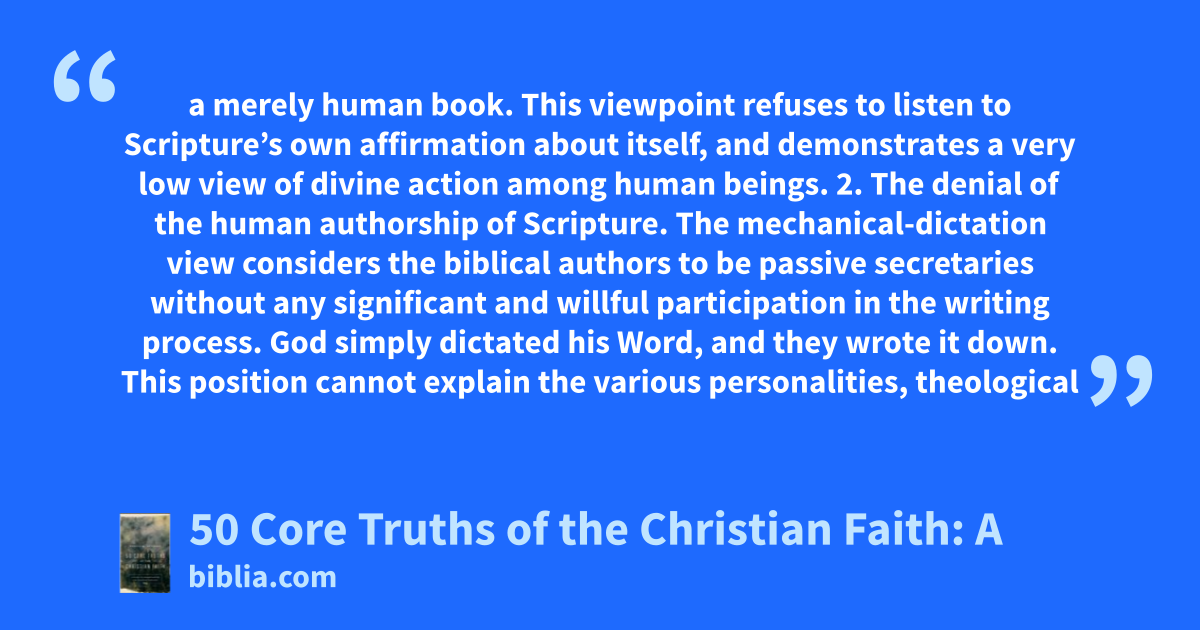 a merely human book. This viewpoint refuses to listen to Scripture’s own affirmation about itself, and demonstrates a very low view of divine action among human beings. 2. The denial of the human authorship of Scripture. The mechanical-dictation view considers the biblical authors to be passive secretaries without any significant and willful participation in the writing process. God simply dictated his Word, and they wrote it down. This position cannot explain the various personalities, theological