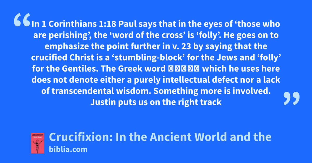 In 1 Corinthians 1:18 Paul says that in the eyes of ‘those who are perishing’, the ‘word of the cross’ is ‘folly’. He goes on to emphasize the point further in v. 23 by saying that the crucified Christ is a ‘stumbling-block’ for the Jews and ‘folly’ for the Gentiles. The Greek word μωρία which he uses here does not denote either a purely intellectual defect nor a lack of transcendental wisdom. Something more is involved. Justin puts us on the right track