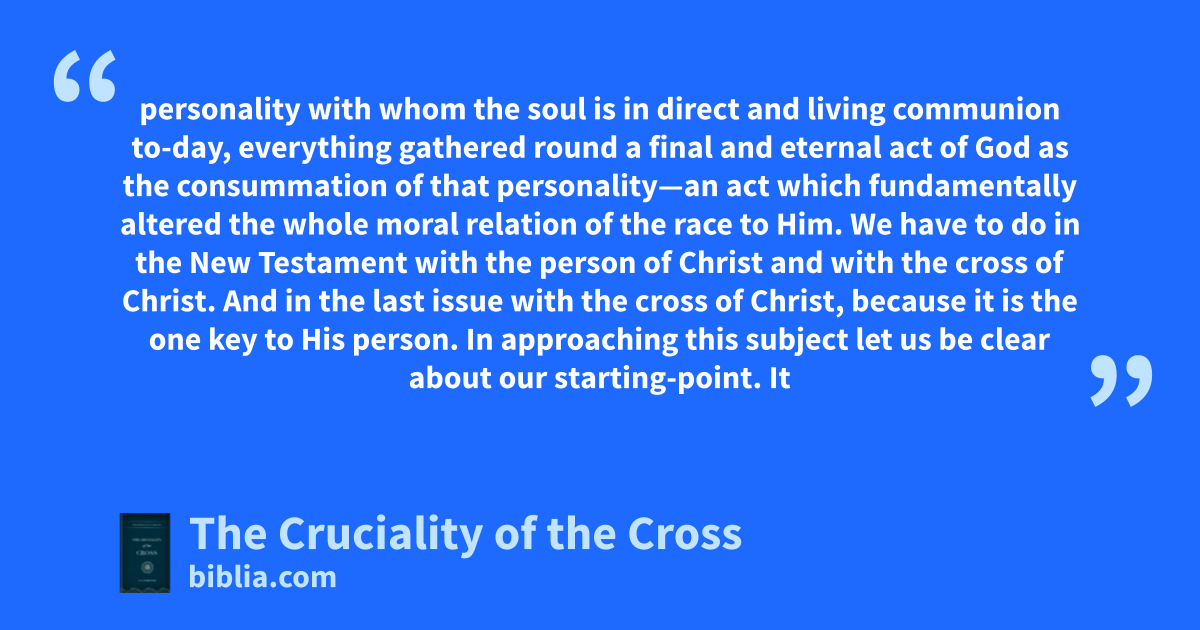 personality with whom the soul is in direct and living communion to-day, everything gathered round a final and eternal act of God as the consummation of that personality—an act which fundamentally altered the whole moral relation of the race to Him. We have to do in the New Testament with the person of Christ and with the cross of Christ. And in the last issue with the cross of Christ, because it is the one key to His person. In approaching this subject let us be clear about our starting-point. It