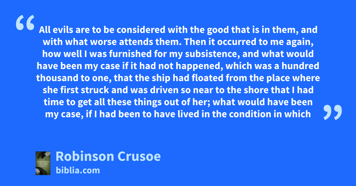 All evils are to be considered with the good that is in them, and with what worse attends them. Then it occurred to me again, how well I was furnished for my subsistence, and what would have been my case if it had not happened, which was a hundred thousand to one, that the ship had floated from the place where she first struck and was driven so near to the shore that I had time to get all these things out of her; what would have been my case, if I had been to have lived in the condition in which