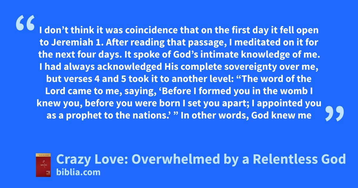 I don’t think it was coincidence that on the first day it fell open to Jeremiah 1. After reading that passage, I meditated on it for the next four days. It spoke of God’s intimate knowledge of me. I had always acknowledged His complete sovereignty over me, but verses 4 and 5 took it to another level: “The word of the Lord came to me, saying, ‘Before I formed you in the womb I knew you, before you were born I set you apart; I appointed you as a prophet to the nations.’ ” In other words, God knew me