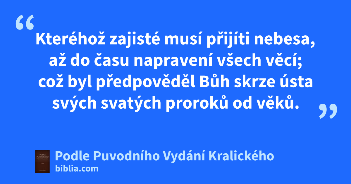 21 Kteréhož zajisté musí přijíti nebesa, až do času napravení všech věcí; což byl předpověděl Bůh skrze ústa svých svatých proroků od věků.