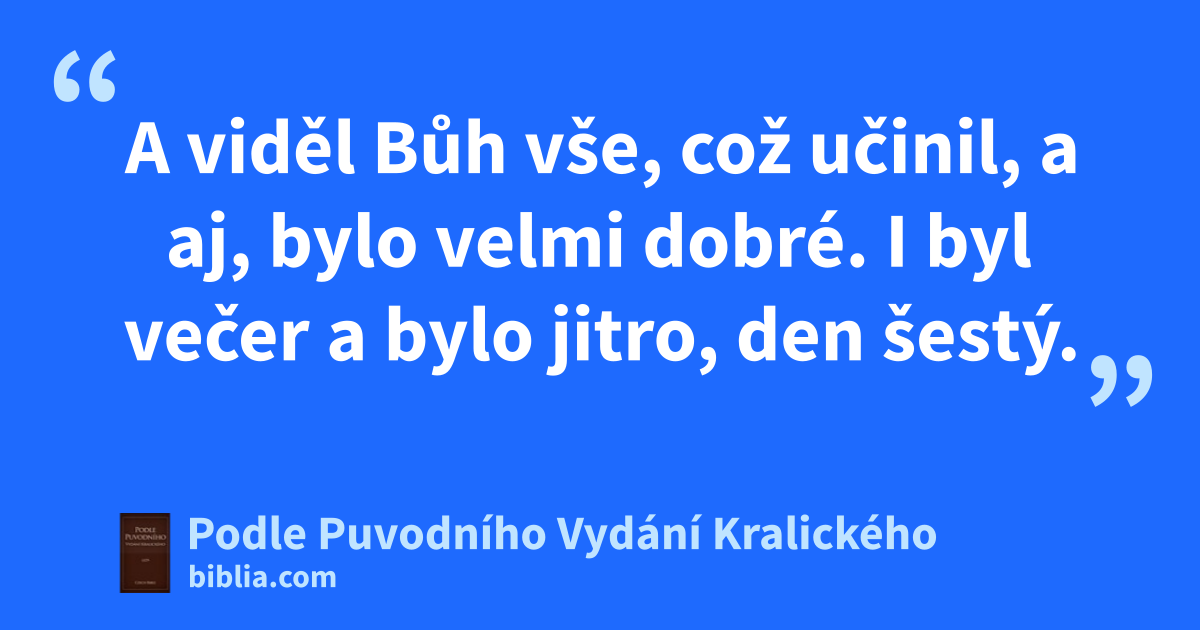 31 A viděl Bůh vše, což učinil, a aj, bylo velmi dobré. I byl večer a bylo jitro, den šestý.