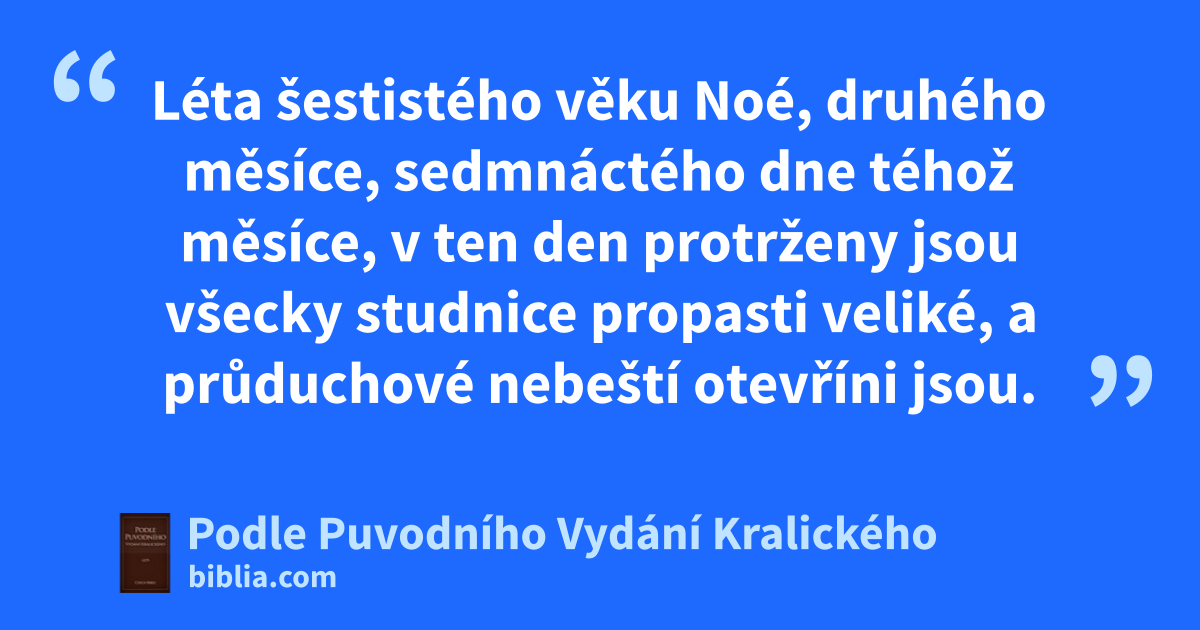 11 Léta šestistého věku Noé, druhého měsíce, sedmnáctého dne téhož měsíce, v ten den protrženy jsou všecky studnice propasti veliké, a průduchové nebeští otevříni jsou.