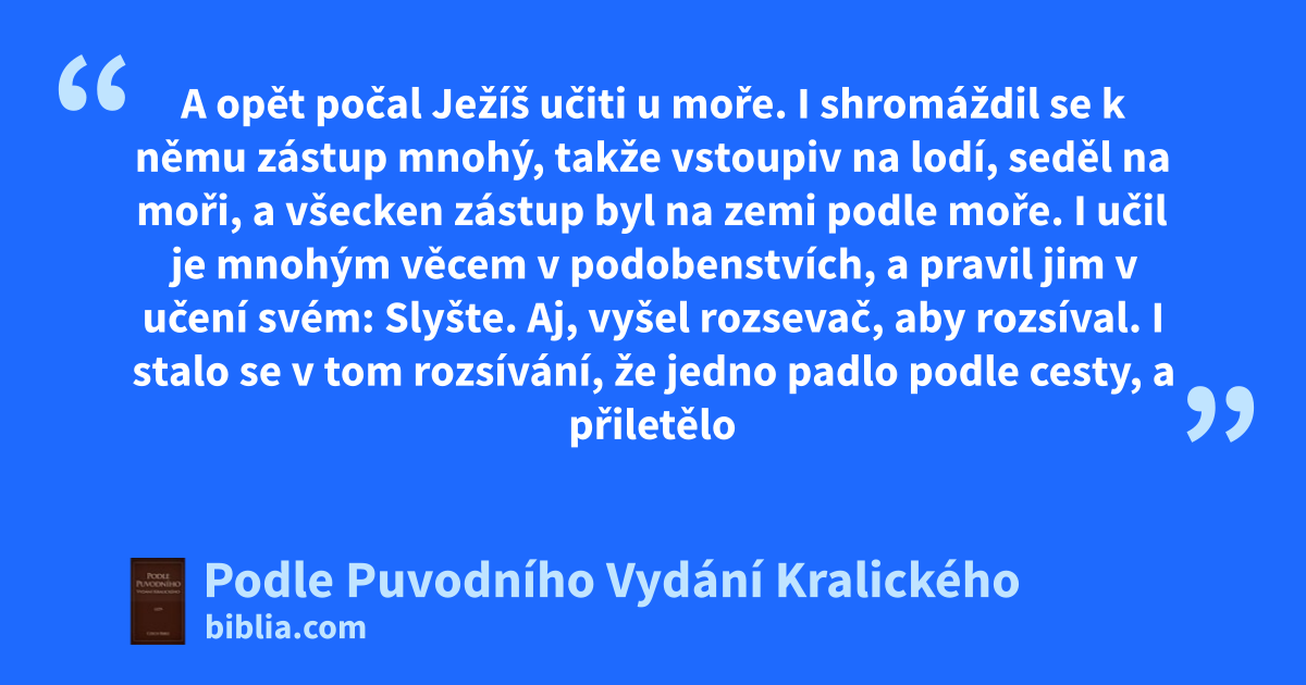 1 A opět počal Ježíš učiti *u moře. I shromáždil se k němu zástup mnohý, takže vstoupiv na lodí, seděl na moři, a všecken zástup byl na zemi podle moře.