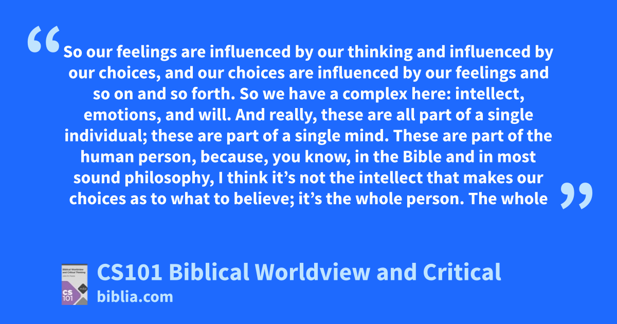 So our feelings are influenced by our thinking and influenced by our choices, and our choices are influenced by our feelings and so on and so forth. So we have a complex here: intellect, emotions, and will. And really, these are all part of a single individual; these are part of a single mind. These are part of the human person, because, you know, in the Bible and in most sound philosophy, I think it’s not the intellect that makes our choices as to what to believe; it’s the whole person. The whole
