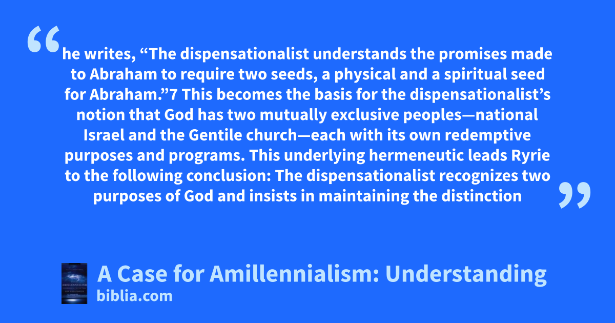 he writes, “The dispensationalist understands the promises made to Abraham to require two seeds, a physical and a spiritual seed for Abraham.”7 This becomes the basis for the dispensationalist’s notion that God has two mutually exclusive peoples—national Israel and the Gentile church—each with its own redemptive purposes and programs. This underlying hermeneutic leads Ryrie to the following conclusion: The dispensationalist recognizes two purposes of God and insists in maintaining the distinction