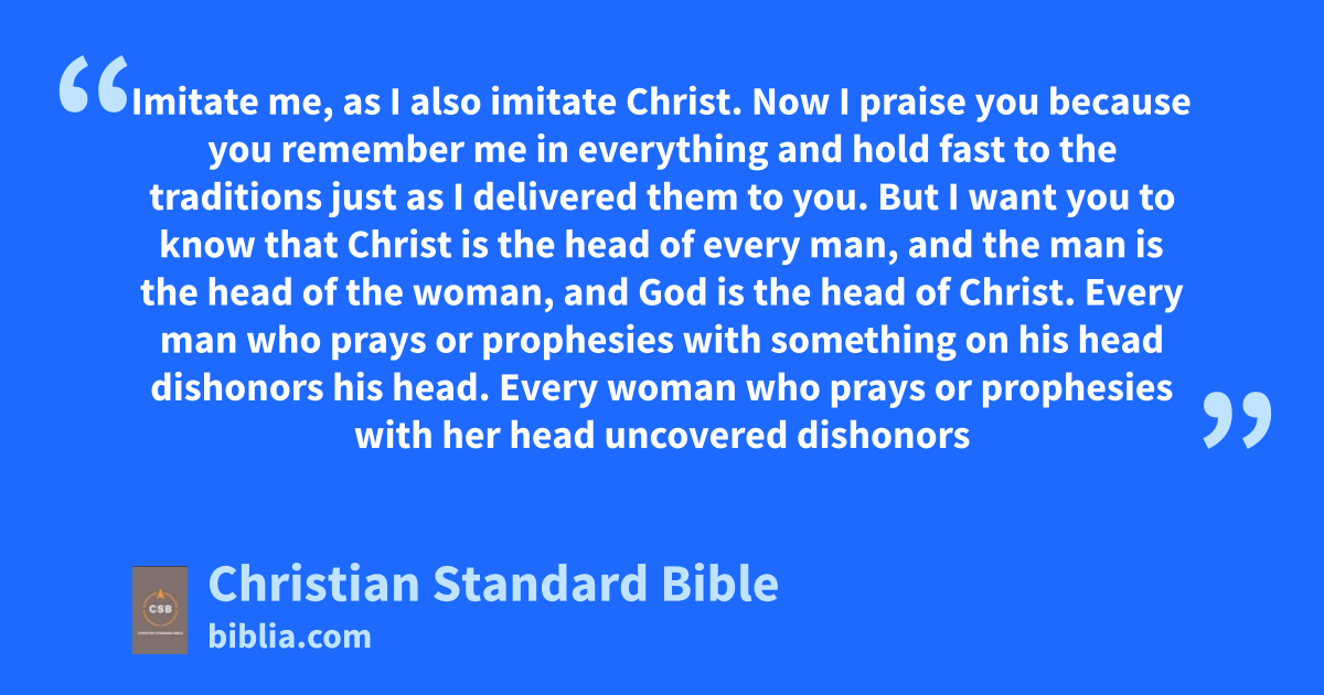 2 Now I praise youD because you remember me in everything and hold fast to the traditionsc just as I deliveredd them to you. 3 But I want you to know that Christ is the heade of every man, and the man is the head of the woman,E,f and God is the head of Christ.g 4 Every man who prays or prophesies with something on his head dishonorsh his head. 5 Every woman who prays or prophesies with her head uncovered dishonors her head, since that is one and the same as having her head shaved.i 6 For if a woman doesn’t cover her head, she should have her hair cut off. But if it is disgraceful for a woman to have her hair cut off or her head shaved, let her head be covered.