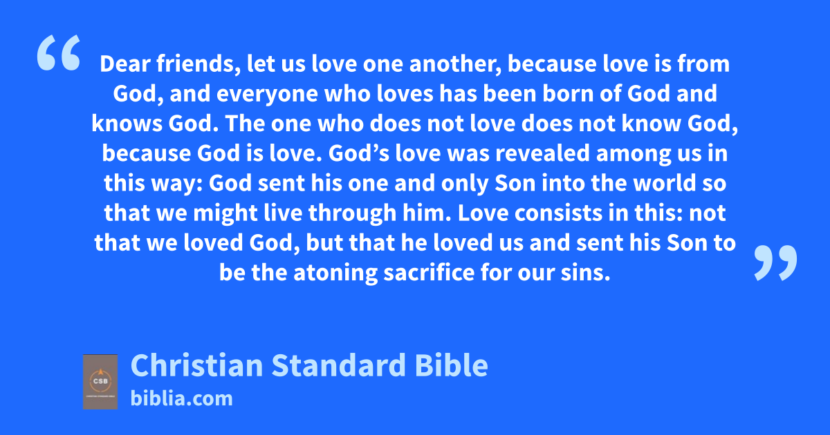 7 Dear friends, let us love one another, because love is from God, and everyone who loves has been born of Godq and knows God. 8 The one who does not love does not know God, because God is love. 9 God’s love was revealed among usB in this way: God sentr his one and only Sons into the world so that we might livet through him. 10 Love consists in this: not that we loved God, but that he loved usu and sent his Son to be the atoning sacrificeC,v for our sins. 11 Dear friends, if God loved us in this way, we also must love one another.w 12 No one has ever seen God.x If we love one another, God remains inD us and his love is made complete in us. 13 This is how we know that we remain in himy and he in us: He has given us of his Spirit.z 14 And we have seen and we testify that the Father has sent his Sonaa as the world’s Savior. 15 Whoever confessesab that Jesus is the Son of God—God remains in him and he in God. 16 And we have come to know and to believe the love that God has for us.