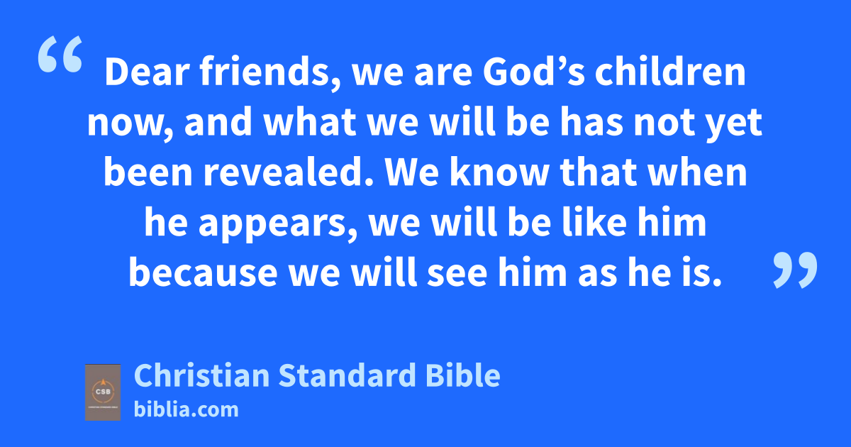 28 So now, little children, remain in him so that when he appearsp we may have confidence and not be ashamed before him at his coming.q 29 If you know that he is righteous, you know this as well: Everyone who does what is right has been born of him.r s 3 See what great loveA the Father has given us that we should be called God’s children—and we are! The reason the world does not know us is that it didn’t know him. 2 Dear friends, we are God’s children now, and what we will be has not yet been revealed.t We know that when he appears,B we will be like himu because we will see him as he is.v 3 And everyone who has this hopew in him purifies himself just as he is pure.x