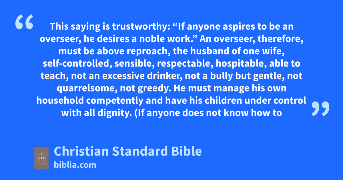 3 This saying is trustworthy:h “If anyone aspires to be an overseer,B,i he desires a noble work.” 2 An overseer,j therefore, must be above reproach, the husband of one wife, self-controlled, sensible,k respectable, hospitable,l able to teach, 3 not an excessive drinker, not a bully but gentle, not quarrelsome, not greedy.m 4 He must manage his own household competently and have his children under control with all dignity. 5 (If anyone does not know how to manage his own household, how will he take care of God’s church?) 6 He must not be a new convert, or he might become conceited and incur the same condemnation as the devil.n 7 Furthermore, he must have a good reputation among outsiders, so that he does not fall into disgrace and the devil’so trap.