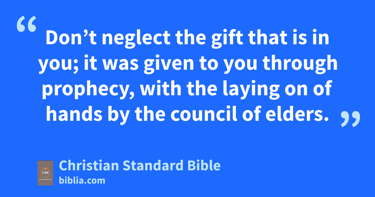 11 Command and teach these things. 12 Don’t let anyone despise your youth, but set an example for the believers in speech,ba in conduct,bb in love,C,bc in faith, and in purity.bd 13 Until I come,be give your attention to public reading, exhortation, and teaching. 14 Don’t neglect the gift that is in you; it was given to you through prophecy,a with the laying on of handsb by the council of elders. 15 Practice these things; be committed to them, so that your progress may be evident to all. 16 Pay close attention to your life and your teaching; persevere in these things, for in doing this you will savec both yourself and your hearers.d