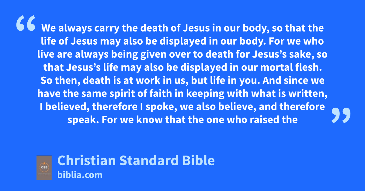 7 Now we have this treasure in clay jars, so that this extraordinary powerg may be from God and not from us. 8 We are afflicted in every way but not crushed; we are perplexed but not in despair; 9 we are persecuted but not abandoned; we are struck down but not destroyed. 10 We always carry the death of Jesush in our body, so that the life of Jesus may also be displayed in our body. 11 For we who live are always being given over to deathi for Jesus’s sake, so that Jesus’s life may also be displayed in our mortal flesh. 12 So then, death is at work in us, but life in you. 13 And since we have the same spirit of faith in keeping with what is written, I believed, therefore I spoke,A,j we also believe, and therefore speak. 14 For we know that the one who raised the Lord Jesus will also raise us with Jesusk and present us with you. 15 Indeed, everything is for your benefit so that, as grace extends through more and more people, it may cause thanksgivingl to increase to the glory of God.