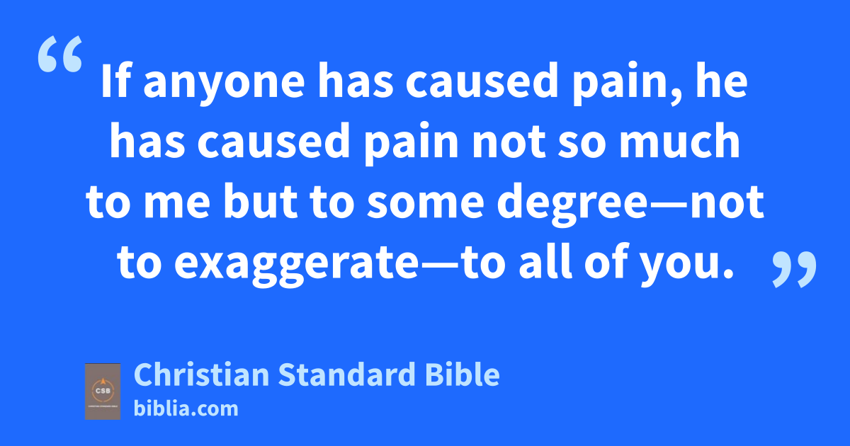 5 If anyone has caused pain, he has caused pain not so much to me but to some degree—not to exaggeratea—to all of you. 6 This punishment by the majority is sufficient for that person. 7 As a result, you should instead forgiveb and comfort him. Otherwise, he may be overwhelmed by excessive grief. 8 Therefore I urge you to reaffirm your love to him. 9 I wrote for this purpose: to test your characterc to see if you are obedientd in everything. 10 Anyone you forgive, I do too. For what I have forgiven—if I have forgiven anything—it is for your benefit in the presence of Christ, 11 so that we may not be taken advantagee of by Satan. For we are not ignorant of his schemes.