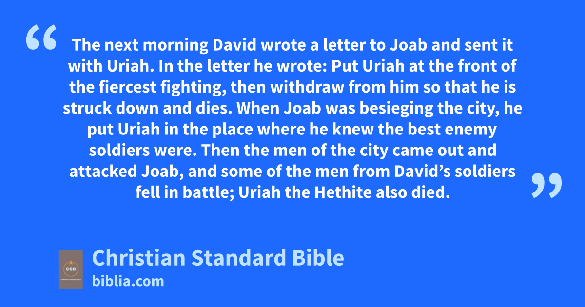 16 When Joab was besieging the city, he put Uriah in the place where he knew the best enemy soldiers were. 17 Then the men of the city came out and attacked Joab, and some of the men from David’s soldiers fell in battle; Uriah the Hethite also died.
