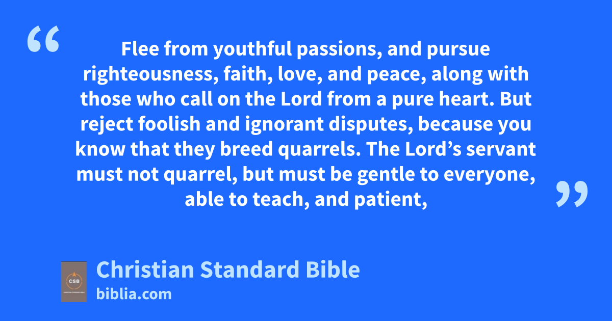 22 Fleen from youthful passions, and pursue righteousness, faith, love, and peace,o along with those who call on the Lordp from a pure heart. 23 But reject foolish and ignorant disputes, because you know that they breed quarrels. 24 The Lord’sq servant must not quarrel,r but must be gentle to everyone, able to teach,I and patient, 25 instructing his opponents with gentleness.s Perhaps God will grant them repentancet leading them to the knowledge of the truth. 26 Then they may come to their senses and escape the trap of the devil,u who has taken them captive to do his will.v