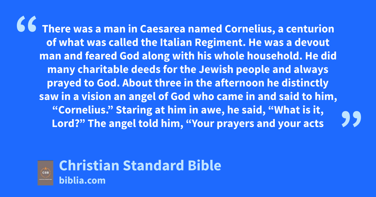10 There was a man in Caesarea named Cornelius, a centurion of what was called the Italian Regiment.n 2 He was a devout man and feared God along with his whole household. He did many charitable deeds for the Jewish people and always prayed to God.o 3 About three in the afternoonB he distinctly saw in a vision an angel of God who came in and said to him, “Cornelius.”p