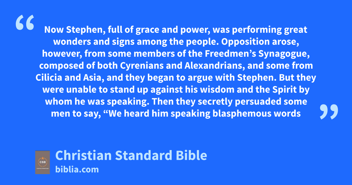 8 Now Stephen, full of grace and power, was performing great wonders and signs among the people. 9 Opposition arose, however, from some members of the Freedmen’s Synagogue, composed of both Cyrenians and Alexandrians, and some from Cilicia and Asia, and they began to argue with Stephen. 10 But they were unable to stand up against his wisdom and the Spirit by whom he was speaking.