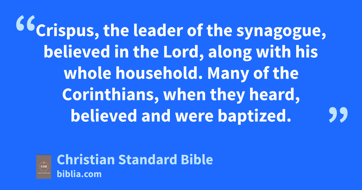 5 When Silas and Timothy arrived from Macedonia, Paul devoted himself to preaching the wordB and testified to the Jews that Jesus is the Messiah.u 6 When they resisted and blasphemed,v he shook out his clothesw and told them, “Your blood is on your own heads!x I am innocent.C From now on I will go to the Gentiles.”y 7 So he left there and went to the house of a man named Titius Justus, a worshiper of God, whose house was next door to the synagogue. 8 Crispus, the leader of the synagogue, believed in the Lord, along with his whole household.z Many of the Corinthians, when they heard, believed and were baptized.