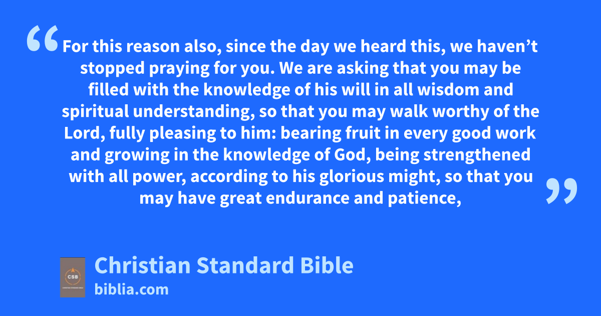 9 For this reason also, since the day we heard this, we haven’t stopped praying for you. We are askingk that you may be filled with the knowledgel of his willm in all wisdom and spiritual understanding,D 10 so that you may walk worthy of the Lord, fully pleasing to him: bearing fruit in every good workn and growing in the knowledge of God,o 11 being strengthenedp with all power,q according to his gloriousr might, so that you may have great endurance and patience, joyfully 12 giving thanks to the Father, who has enabled youE to share in the saints’ inheritance in the light.s 13 He has rescuedt us from the domain of darkness and transferred us into the kingdomu of the Sonv he loves.w 14 In him we have redemption,F the forgiveness of sins.