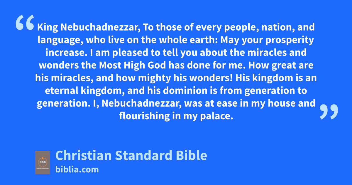 4 I, Nebuchadnezzar, was at ease in my house and flourishing in my palace.b 5 I had a dream, and it frightened me; while in my bed, the images and visions in my mind alarmed me.c 6 So I issued a decreed to bring all the wise men of Babylon to me in order that they might make the dream’s interpretation known to me.e 7 When the magicians, mediums, Chaldeans, and diviners came in, I told them the dream, but they could not make its interpretation known to me.f