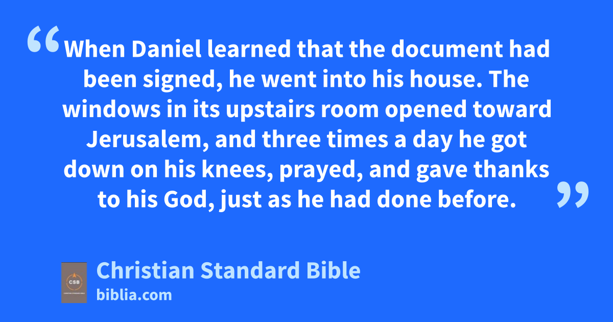 10 When Daniel learned that the document had been signed, he went into his house. The windows in its upstairs room opened toward Jerusalem,m and three times a day he got down on his knees, prayed, and gave thanks to his God,n just as he had done before. 11 Then these men went as a group and foundo Daniel petitioning and imploring his God. 12 So they approached the kingp and asked about his edict: “Didn’t you sign an edict that for thirty days any person who petitions any god or man except you, the king, will be thrown into the lions’ den?”