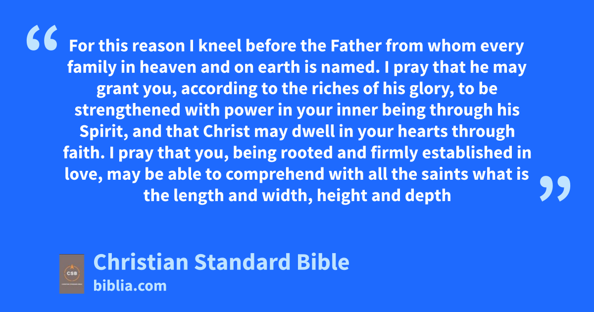 14 For this reason I kneelak before the FatherC 15 from whom every family in heaven and on earth is named. 16 I pray that he may grant you, according to the richesal of his glory,am to be strengthened with poweran in your inner beingao through his Spirit, 17 and that Christ may dwell in your hearts through faith. I pray that you, being rooted and firmly established in love, 18 may be able to comprehend with all the saints what is the length and width, height and depth of God’s love,ap 19 and to know Christ’s love that surpasses knowledge, so that you may be filled with all the fullness of God.