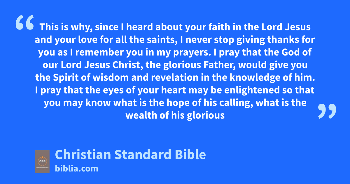 15 This is why, since I heard about your faith in the Lord Jesus and your love for all the saints, 16 I never stop giving thanks for you as I remember you in my prayers. 17 I pray that the God of our Lord Jesus Christ, the glorious Father,G would give you the SpiritH,v of wisdom and revelationw in the knowledge of him. 18 I pray that the eyes of your heart may be enlightened so that you may know what is the hopex of his calling,y what is the wealth of his glorious inheritance in the saints, 19 and what is the immeasurable greatness of his powerz toward us who believe, according to the mighty working of his strength.