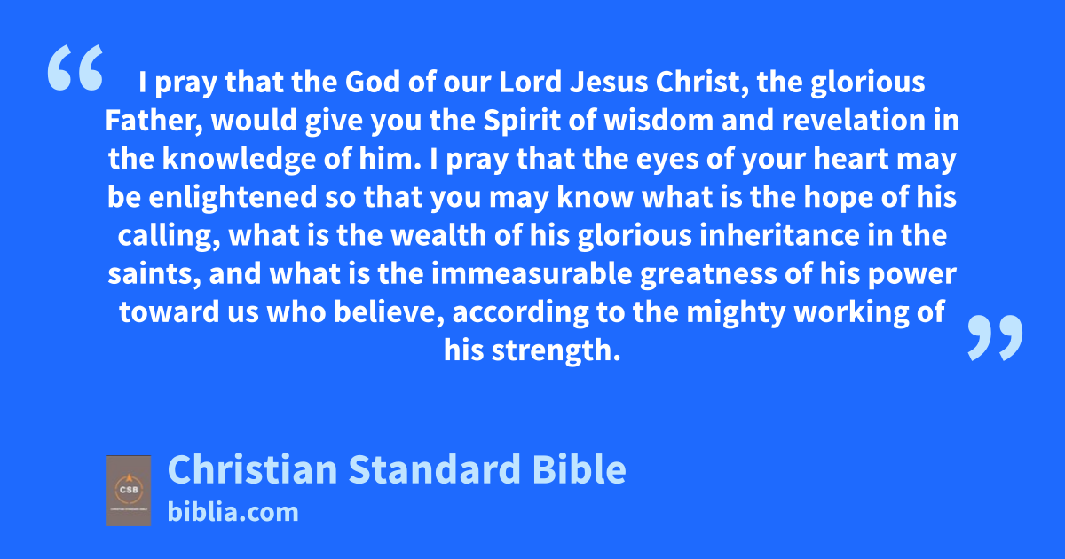 15 This is why, since I heard about your faith in the Lord Jesus and your love for all the saints, 16 I never stop giving thanks for you as I remember you in my prayers. 17 I pray that the God of our Lord Jesus Christ, the glorious Father,G would give you the SpiritH,v of wisdom and revelationw in the knowledge of him. 18 I pray that the eyes of your heart may be enlightened so that you may know what is the hopex of his calling,y what is the wealth of his glorious inheritance in the saints, 19 and what is the immeasurable greatness of his powerz toward us who believe, according to the mighty working of his strength.