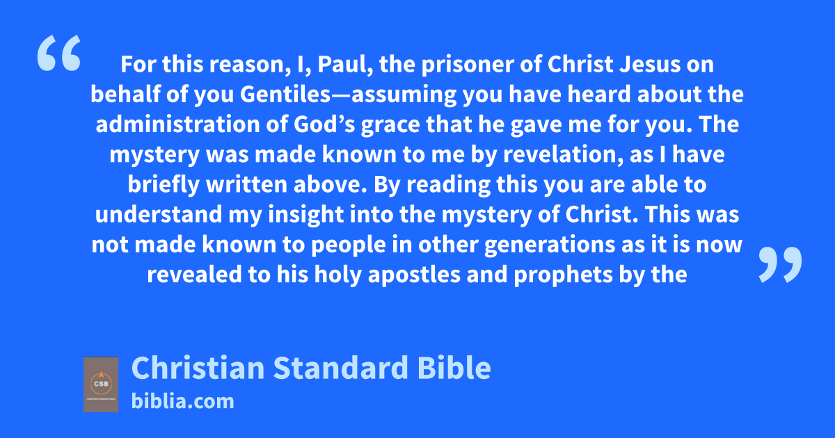 3 For this reason, I, Paul, the prisonerw of Christ Jesus on behalf of you Gentiles—2 assuming you have heard about the administration of God’s grace that he gave me for you. 3 The mystery was made known to me by revelation,x as I have briefly written above. 4 By reading this you are able to understand my insight into the mystery of Christ.y 5 This was not made known to peopleA in other generations as it is now revealed to his holy apostles and prophetsz by the Spirit: 6 The Gentiles are coheirs, members of the same body, and partners in the promiseaa in Christ Jesus through the gospel. 7 I was made a servant of this gospel by the gift of God’s grace that was given to me by the working of his power.ab
