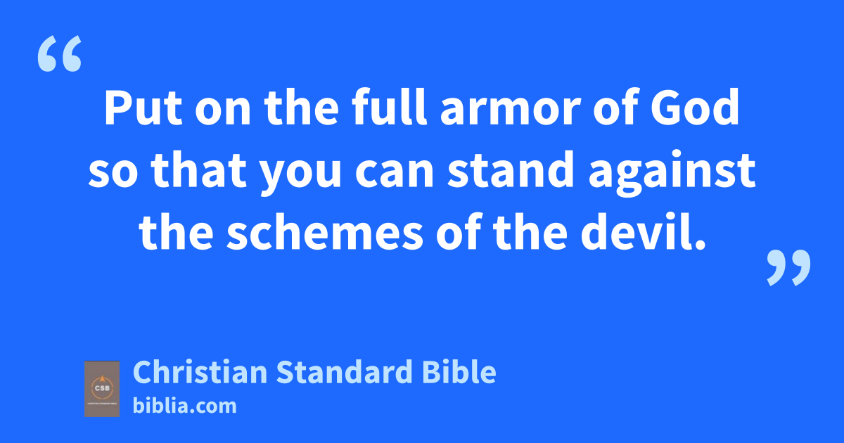 10 Finally, be strengthened by the Lord and by his vast strength.ak 11 Put onal the full armoram of God so that you can stand against the schemes of the devil. 12 For our struggle is not against fleshan and blood, but against the rulers, against the authorities,ao against the cosmic powers of this darkness, against evil,ap spiritual forces in the heavens.aq 13 For this reason take up the full armorar of God, so that you may be able to resistas in the evil day, and having prepared everything, to take your stand. 14 Stand,at therefore, with truthau like a belt around your waist, righteousnessav like armor on your chest,aw 15 and your feet sandaled with readiness for the gospel of peace. 16 In every situation take up the shieldax of faithay with which you can extinguish all the flaming arrows of the evil one.az 17 Take the helmetba of salvation and the swordbb of the Spiritbc—which is the word of God. 18 Praybd at all times in the Spiritbe with every prayer and request, and stay alertbf with all perseverance and intercession for all the saints. 19 Pray also for me, that the message may be given to me when I open my mouth to make known with boldnessbg the mystery of the gospel. 20 For this I am an ambassadora in chains. Pray that I might be bold enough to speak about it as I should.