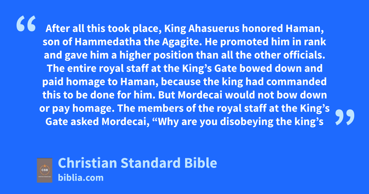 3 After all this took place, King Ahasuerus honored Haman, son of Hammedatha the Agagite.z He promoted him in rank and gave him a higher position than all the other officials.aa 2 The entire royal staff at the King’s Gateab bowed down and paid homage to Haman, because the king had commanded this to be done for him. But Mordecai would not bow down or pay homage.a 3 The members of the royal staff at the King’s Gate asked Mordecai, “Why are you disobeying the king’s command?” 4 When they had warned him day after dayb and he still would not listen to them, they told Haman in order to see if Mordecai’s actions would be tolerated, since he had told them he was a Jew.
